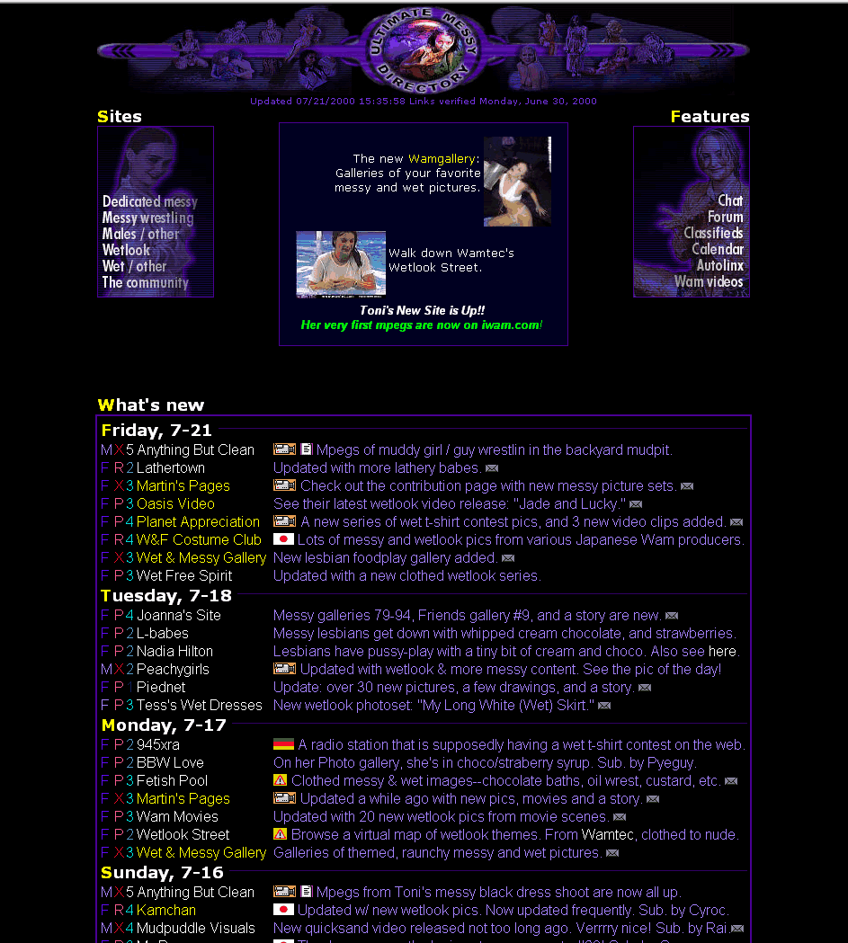 Started in 1998 as a plain collection of text links to various web finds submitted by the very members who frequented the site, we grew within a year to include a chat room, forum, and e-mail list. A good number of people were already aware that wam was "a thing" because of pioneers who had long before released wam magazines, VHS, and web sites. Now folks had another place to meet others who also liked their personal brand of sploshing.