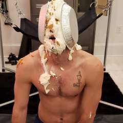 Larzstord was surprised by Messyblondie05 with a big sloppy cream pie to the face